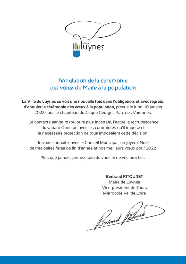La Ville de Luynes se voit une nouvelle fois dans l’obligation, et avec regrets, d’annuler la cérémonie des vœux à la population, prévue le lundi 10 janvier 2022 sous le chapiteau du Cirque Georget, Parc des Varennes.
