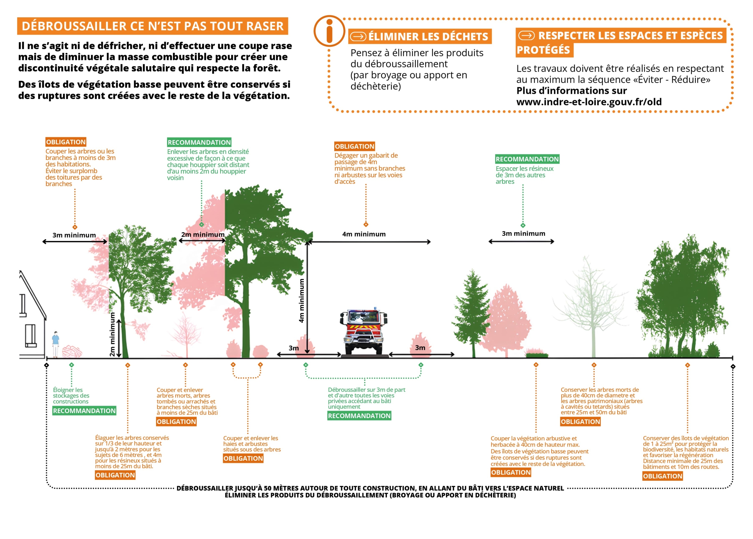 En zone non urbaine : L’obligation de débroussailler porte sur un rayon de 50m autour des constructions ou installations et sur une mise au gabarit de 4 × 4 mètres de la voie d’accès.
