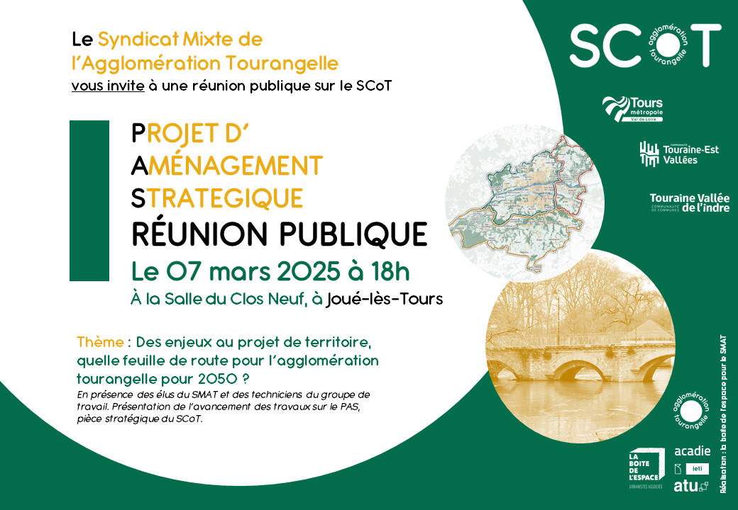 Après deux ans de réflexion et de discussion, le Schéma de Cohérence Territoriale (SCoT) de l’agglomération tourangelle arrive à l’aboutissement d’une première étape importante : la définition de son Projet d’Aménagement Stratégique. Afin d’informer et d’échanger avec les habitants et les acteurs locaux, le Syndicat Mixte de l’Agglomération Tourangelle (SMAT) a le plaisir de vous inviter à une réunion publique.