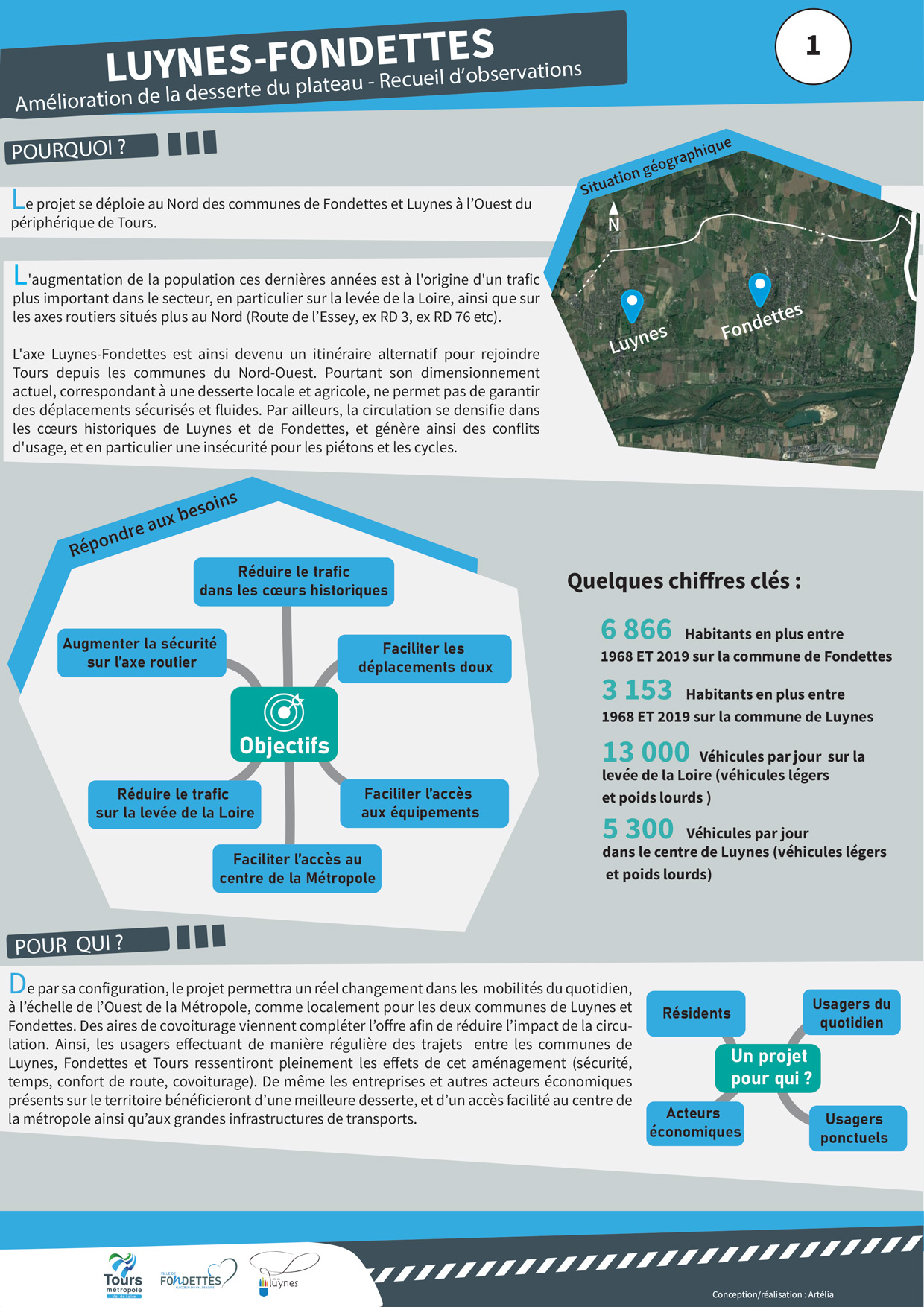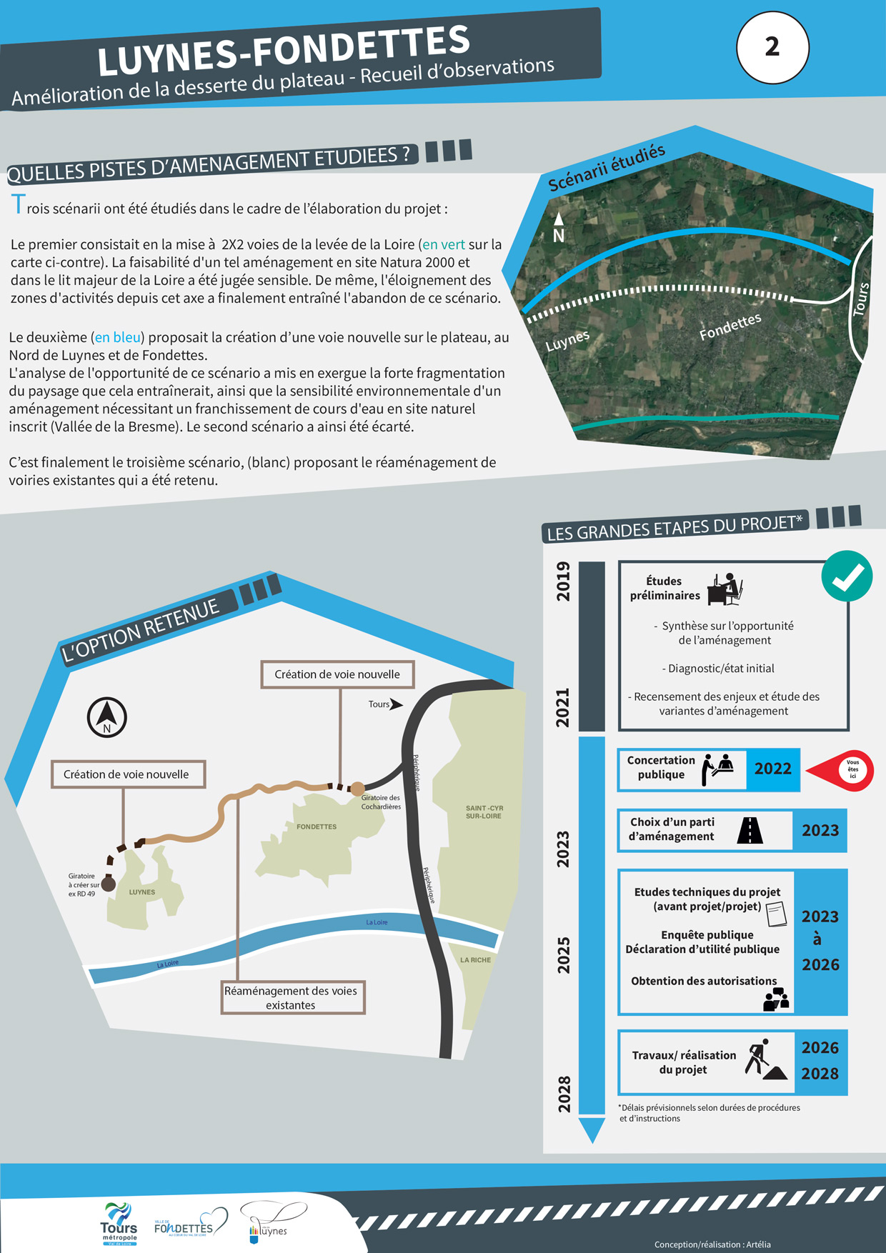 Une concertation publique pour la présentation des études est programmée du 17 août au 20 septembre 2022 dans les mairies des communes de Fondettes et Luynes ainsi qu’au siège de Tours Métropole Val de Loire.
